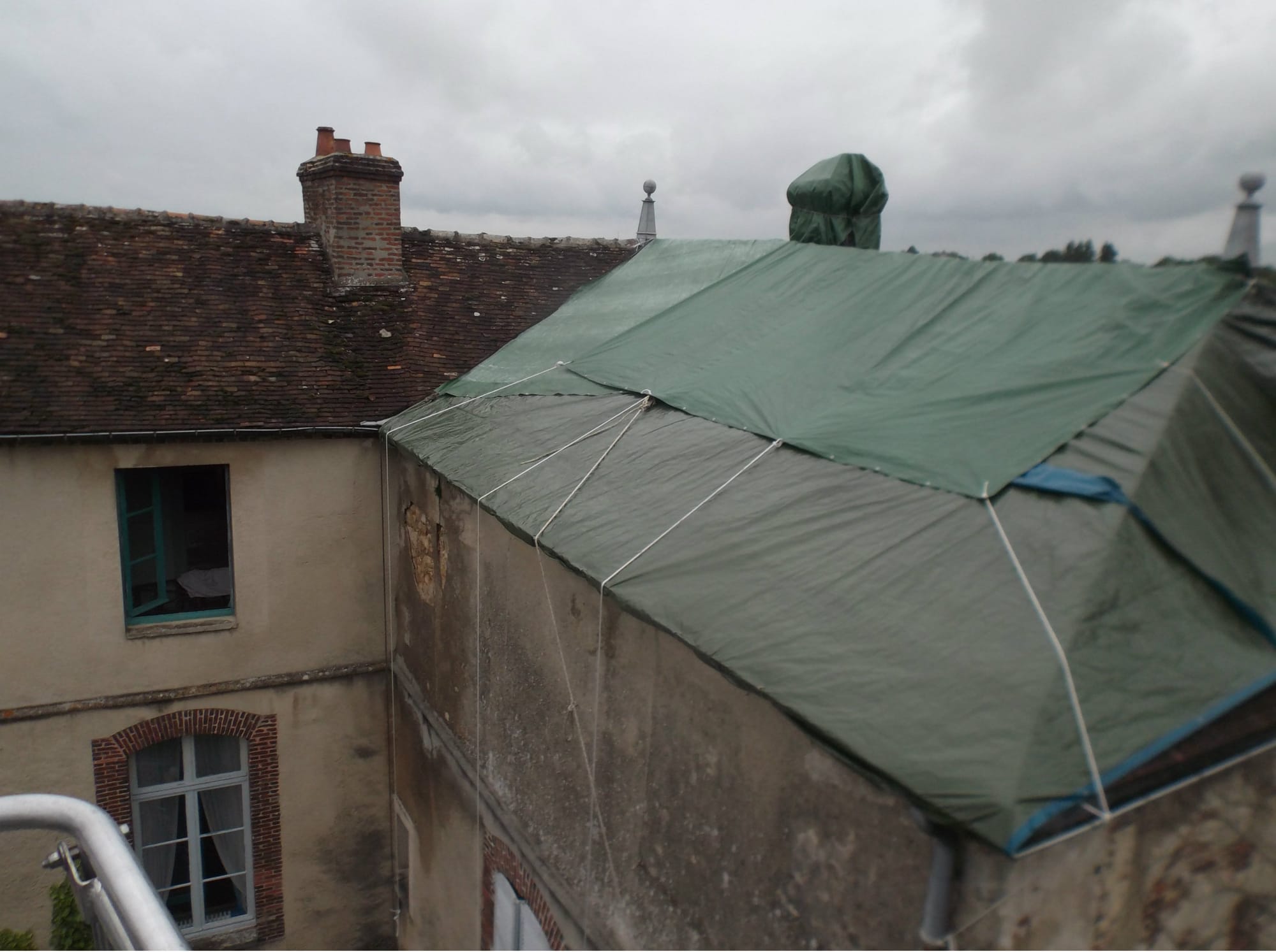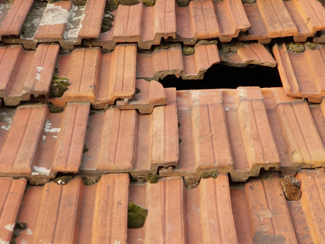 Une infiltration d'eau sur toiture, remplacement de tuile cassée, tempête, bâchage provisoire ...